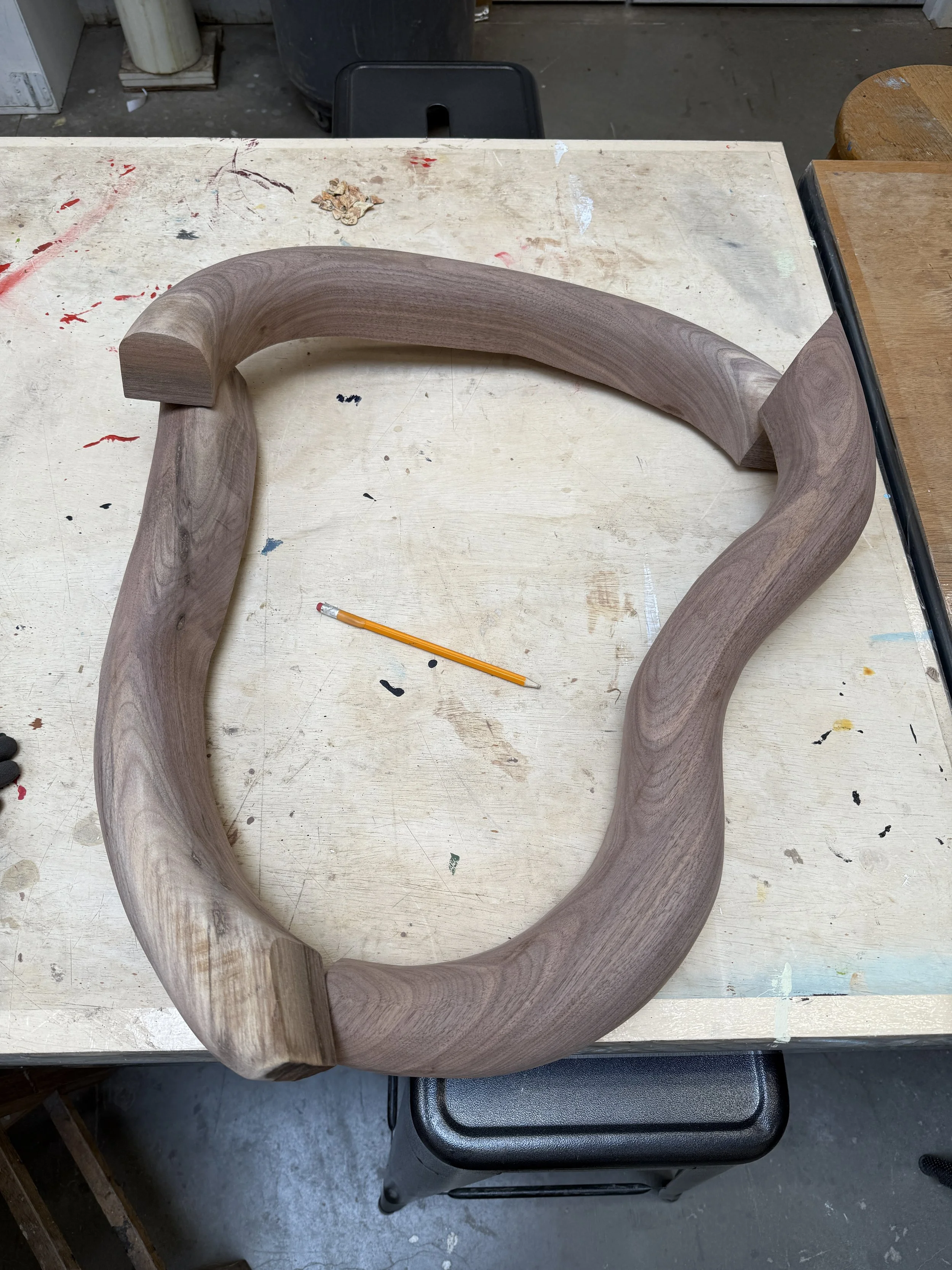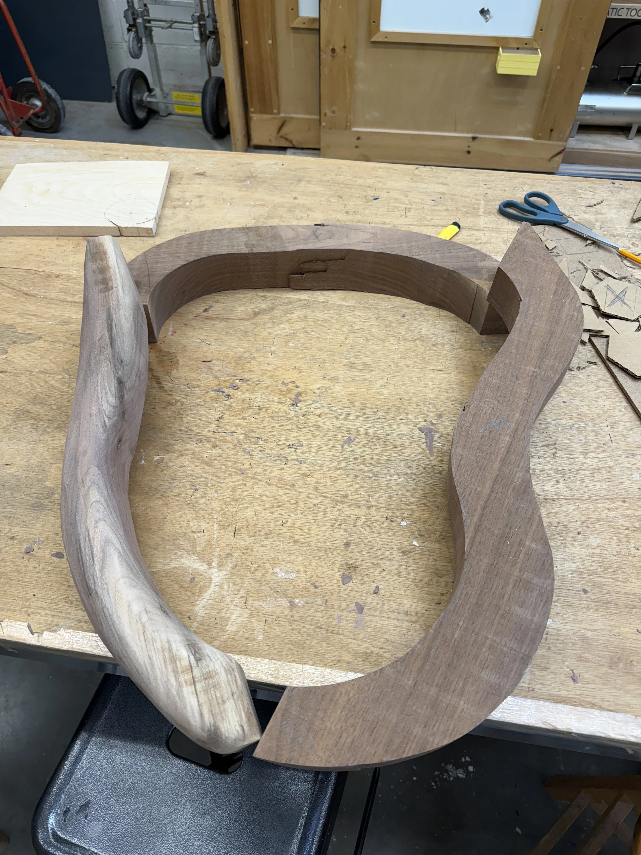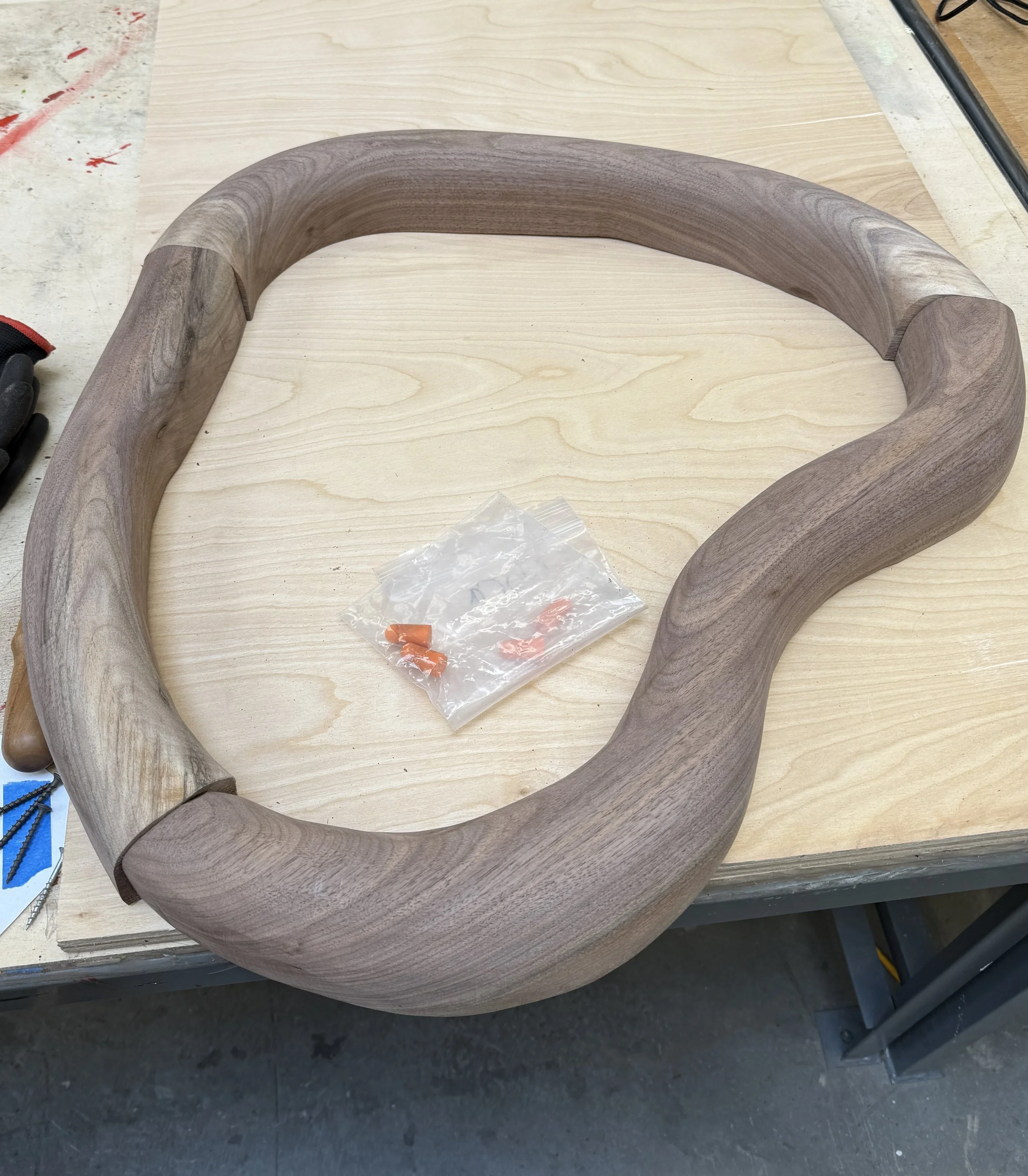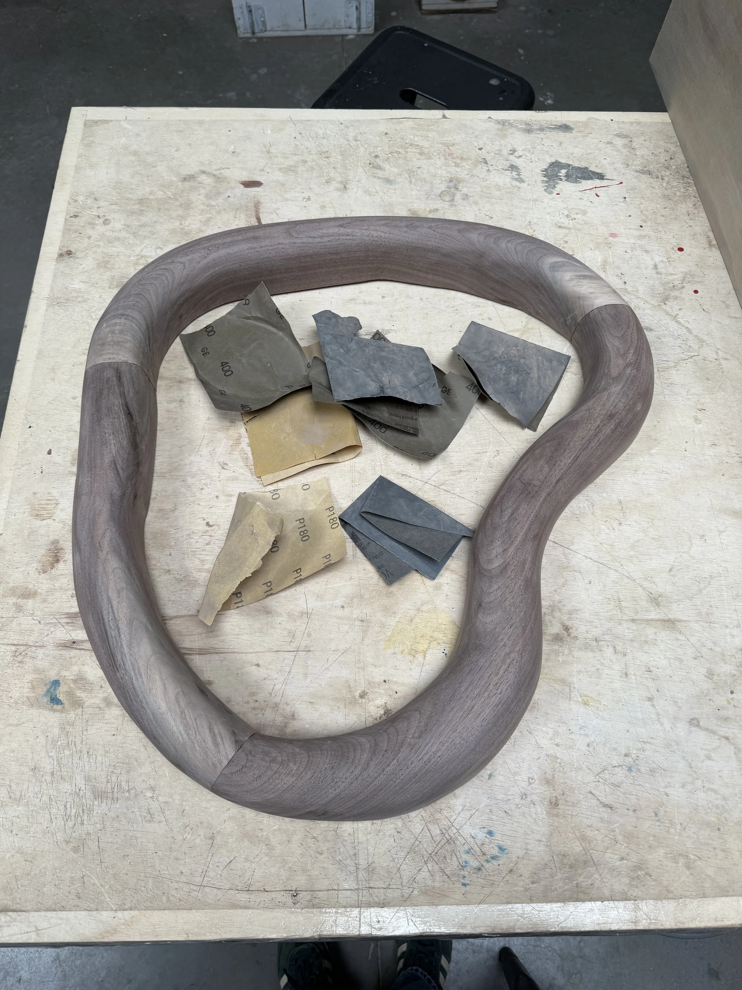LOTS of jigsawing later, I had three curves pieces (one of which I’d begun to sand in this picture)
