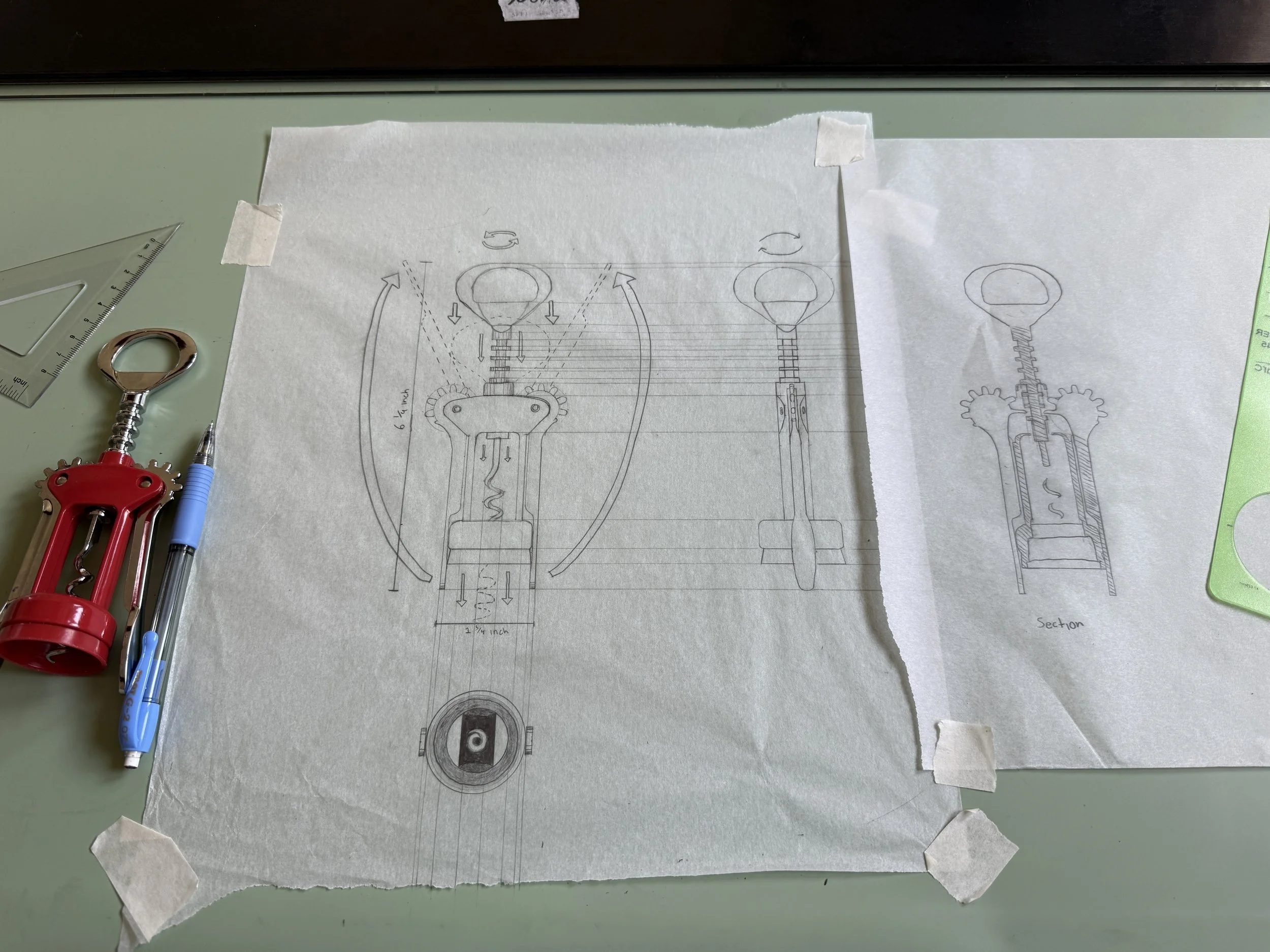 In my Architectural Design class I drew to scale plans, sections, elevations, isometrics, and use drawings of a wine opener. These drawings culminated in a presentation on the function of my tool as explained using the diagrams.